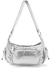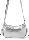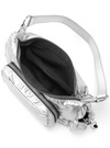 フロントのファスナーポケットとサイドのドロストポケットがポイント。光沢のある生地がコーデのアクセントになってY2Kルックにマッチ。
