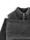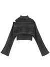 ハイネックのノースリーブトップスに、クロップド丈のニットを重ねたセットアイテム。立体感のあるリブ編みとデニムのようなサンドウォッシュ加工がエッジを加える。
