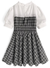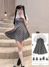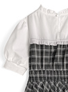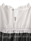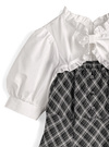 チェック柄ワンピースにをブラウスをレイヤードしたようなデザインが魅力。ボレロ風のトップス部分は、ふりふりのフリルに加え、フロントがリボンモチーフになっておりとびきりキュート。