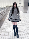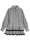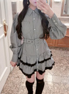 さらっとしたハリのある生地感が魅力のストライプ柄ワンピース。スカート部分はティアードフリルにレースをあしらい、ボリュームたっぷりのシルエットに。