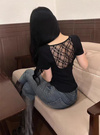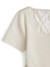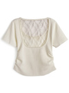 透け感のあるレースを大胆にあしらった、ガーリーなバックスタイルのトップス。さり気ない肌見せが女性らしさを引き立てる一着。