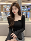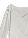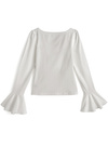 胸元の曲線的なハートカッティングがフェミニンな印象のトップス。袖口のフレアデザインが動く度に揺れて手元を華やかにしてくれる。
