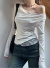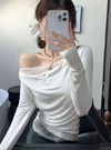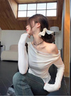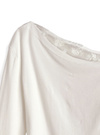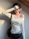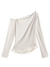 滑らかなカットソー素材で仕立てた、色っぽさがにじみ出るワンショルトップス。胸元や裾からちらりと覗くレースディテールがフェミニンポイント。