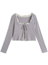 フロントリボンとレース使いがアクセントになった、カーディガンとキャミソールのアンサンブル。