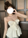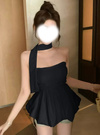付属のリボンは、バスト下中央の穴に通して結んだり、ホルターネックにしたり、タイのように首に巻いたりなど3Wayの着方が楽しめる。