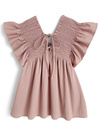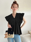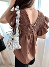 ふんわりと広がる袖や裾のフレアラインが華やかなブラウス。たっぷりのシャーリングで表現した深めのVネックがフェミニンなポイント。