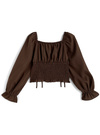 さらっとした軽やかな素材にギャザーディテールを施したブラウス。バスト下の切り替えやウエスト部分のドロストリボン、バックにはシャーリングを効かせることで細見え効果抜群。