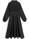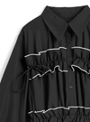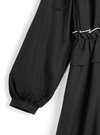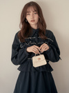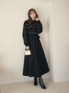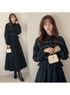 胸元に立体的なフリルやリボンをあしらったフェミニンなワンピース。襟デザインできちんと感もあり、甘すぎない雰囲気に仕上げた。