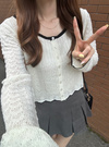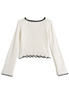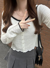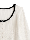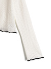 繊細な透かし編みニットが映える、ソフトな肌あたりのカーディガン。襟や袖口、裾に配した配色のスカラップが、全体を引き締めるアクセントに。
