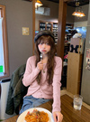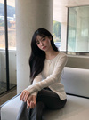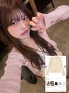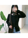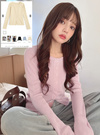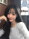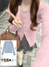 タテを強調する細リブ素材が、全体をすっきりと見せるカーディガン。デコルテがのぞくラウンドネックで、顔まわりを柔らかく演出。
