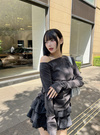 ほんのり透け感を帯びたベロア素材が、上品な艶めきを纏う。アシンメトリーなワンショルダーが、デコルテを美しく演出。