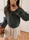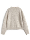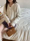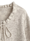 首元のフリルとリボンデザインがフェミニンな印象を与えるニットカーディガン。ふんわりとしたウール混素材を使用しており、柔らかく軽やかな着心地。