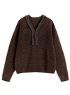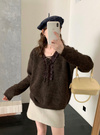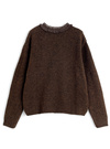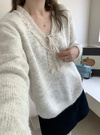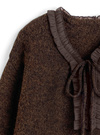 ネックまわりのシアーフリルや細めリボンがナチュラルガーリーな印象のトップス。柔らかな風合いのウール混素材を使用しており暖かい着心地が魅力的。