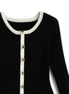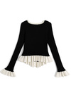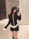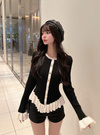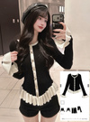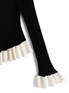 配色デザインとフリルディテールが目を惹くニットカーディガン。