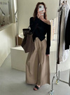 アシンメトリーなワンショルダーとヘムラインが、抜け感のあるシルエットをメイク。