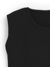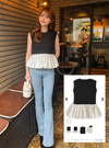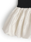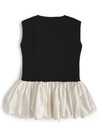 すっきりとしたノースリニットに異素材ドッキングを施したトップス。立体的なバルーンフォルムが女性らしさを引き立てるポイント。
