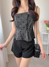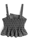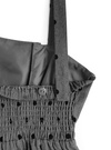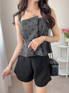 柔らかな風合いの生地にフロッキーのドット柄をあしらったビスチェ。アシンメトリーなタックデザインで立体感を持たせたシルエットが魅力。