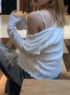ほんのり透け感のあるリブ編みニットが、抜け感のあるスタイルを演出。フィット感のあるシルエットと長めの袖丈が、華奢な印象を引き立てる。