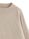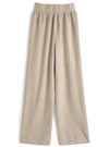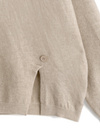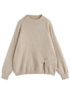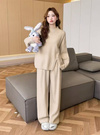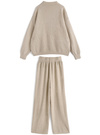 ゆるっとしたシルエットのニットトップスとワイドパンツのセットアップ。トップスの裾にあしらったボタンとスリットデザインがさり気ないポイント。