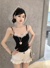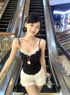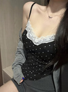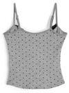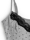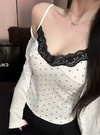 クラシカルなドット柄プリントと胸元のレース使いがガーリーなキャミソール。タックを入れた立体的なバストデザインでランジェリーライクに仕上げた。