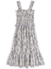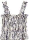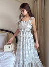 繊細なタッチのフラワー模様が可憐な印象を与えるキャミワンピース。ショルダーや身頃のフリルディテールとさりげないリボンもフェミニンなアクセント。