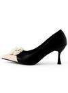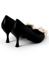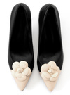 存在感のあるお花モチーフをあしらった、華やかでクラシカルなムード漂うパンプス。つま先の切り替えにはグログラン調の生地を使用し、上品なコントラストを効かせたデザインに。