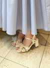ランダムに配置された光沢のある立体リボンがキュートな印象のサンダル。コーディネートにプラスするだけで足元を華やかに演出してくれる。
