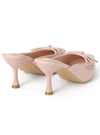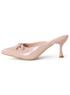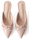 ツヤッとした光沢感のあるエナメル調素材を使用した上品なミュール。ポインテッドトゥがシャープな印象を与えつつ、リボンを添えることで甘さをプラス。