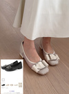 メッシュ素材に格子柄を施し、キラキラのラインストーンをのせた華やかなパンプス。先端のレザー調生地とビジューパーツを組み合わせたリボンモチーフもポイント。
