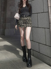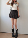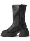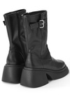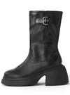 上品なツヤ感のフェイクレザー素材を使用したミドル丈のブーツ。サイドにあしらったベルトモチーフがクールなワンポイントに。