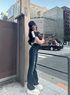 タイトなトップスやインナーとも好相性で、Y2Kライクなルックに仕上がる。
