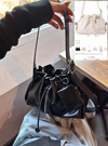 上品な艶感のフェイクレザー素材で仕立てた巾着デザインのバッグ。やや丸みのあるフォルムが、女性らしい印象を引き立ててくれる。