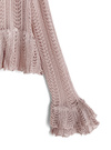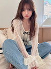レースのような透かし編みデザインが魅力のレーシーニットカーディガン。フロントに並んだサテンリボンが上品な甘さを添えるアクセントに。
