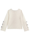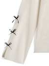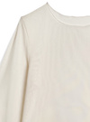 素肌がほんのり透けるシアー素材で仕立てたトップスが登場。袖部分に細めリボンを3つ並べ、さり気ないガーリー要素をオン。