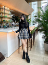 レトロなチェック柄でシーズンムードがぐっと高まるミニスカートが登場。コルセットのようなワイドウエストと、たっぷりとしたティアードデザインがメリハリのあるボディラインに。