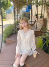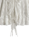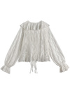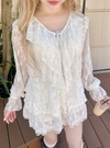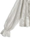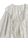 品のいいフラワーレースとラッフルディテールが際立つ儚げなブラウス。ソフトで肌なじみの良い透け素材が魅力で、さりげない肌見せにも効果的。