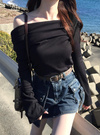 ワンショルダー仕様が肩まわりを美しく見せ、抜け感のあるスタイリングを演出。ボディラインを強調するウエストギャザーや、ひらりと広がるフレアスリーブが女性らしさを引き立てる。