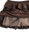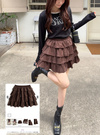 滑らかな風合いのスエード生地が魅力のミニスカート。ボリューミーなティアードフリルは、履くだけで気分が上がるアイテム。