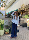 ミニ丈ボトムと合わせてフェミニンに、デニムでカジュアルダウンするのも◎。