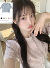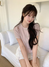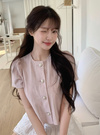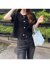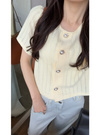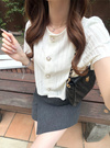 ベーシックなラウンドネックにぷっくりとしたパールボタンが上品な雰囲気。