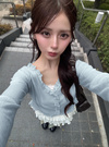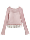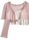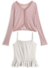 透け感のあるリブカーディガンと、裾フリルをあしらったキャミソールのセット。繊細なレース使いでレディな雰囲気に仕上げたカーディガン。
