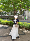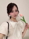 シアーのボウタイブラウスとカーディガンを合わせたようなレイヤード風デザイン。リボンが顔まわりをパッと華やかに演出してくれ、大人フェミニンな雰囲気。