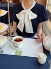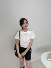 ふんわりとした半袖のバルーンスリーブも、女性らしさを引き立てるポイント。