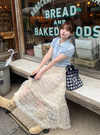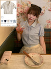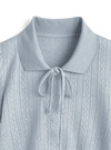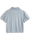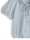 繊細な透かし編みデザインにリボンがアクセントになったガーリーな一枚。襟付きできちんと感がありつつ、丸みのあるパフスリーブで甘さをプラス。