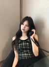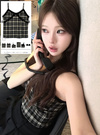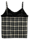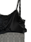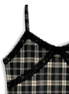 シックなチェック柄に、レースでトリミングを施したキャミソール。カップ付きの仕様なので、一枚で着用でき下着に困らないのが魅力。