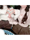 定番のニットトップスにケーブル編みを施すことで表情を多彩にアレンジ。胸元はハート型のカッティングで、フェミニンな雰囲気の中にモードなエッセンスを加える。