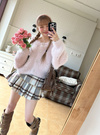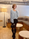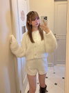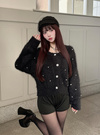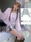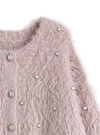 ふんわりとしたシャギーニットにパールやストーンを散りばめた、華やかなルックスのカーディガン。キラキラ輝くビジューボタンを並べ、さらに乙女心をくすぐるデザインに仕上げた。