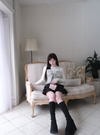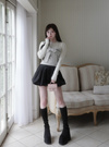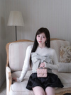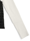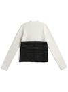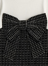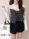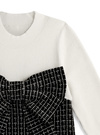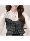 柔らかなリブニットにシックなツイード調生地をドッキングしたトップス。フロントにあしらった存在感抜群の大きなリボンが顔まわりを華やかに演出。