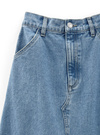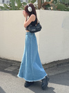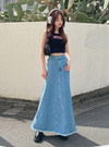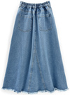 フリンジのヘムがノスタルジックな魅力を引き立てるマキシスカート。デニムをリメイクしたようなデザインがヴィンテージライクな印象に。