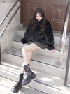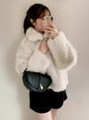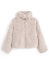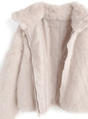 毛足が長くボリュームたっぷりなフォックス風のエコファージャケット。ベルトデザインのスタンドネックがスタイリッシュな雰囲気を演出。